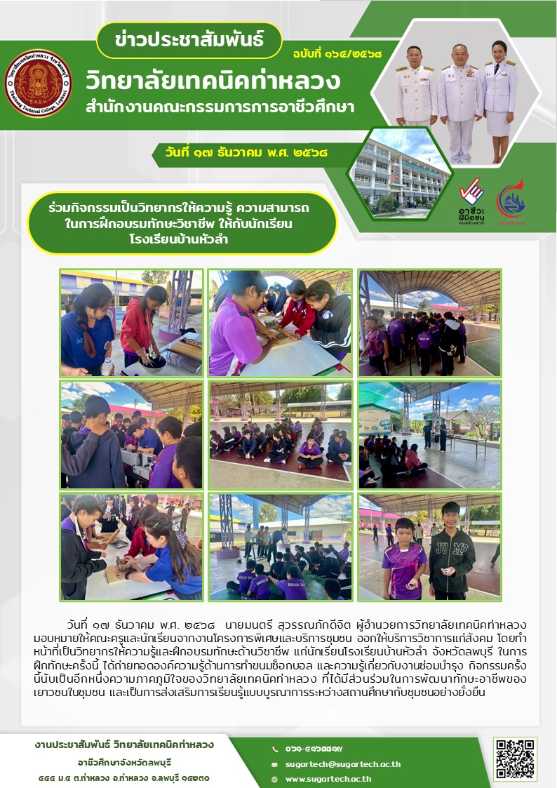 เป็นวิทยากรให้ความรู้ ความสามารถในการฝึกอบรมทักษะวิชาชีพ ให้กับนักเรียนโรงเรียนบ้านหัวลำ