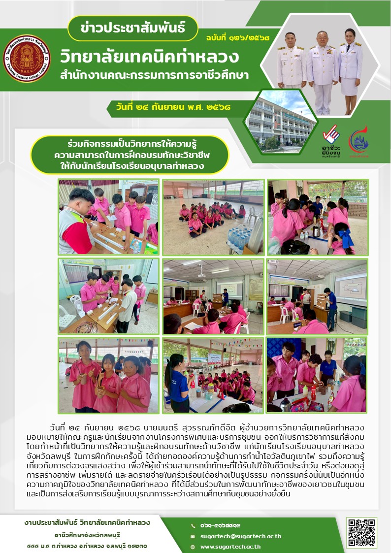 ร่วมกิจกรรมเป็นวิทยากรให้ความรู้ ความสามารถในการฝึกอบรมทักษะวิชาชีพ ให้กับนักเรียนรร.อนุบาลท่าหลวง
